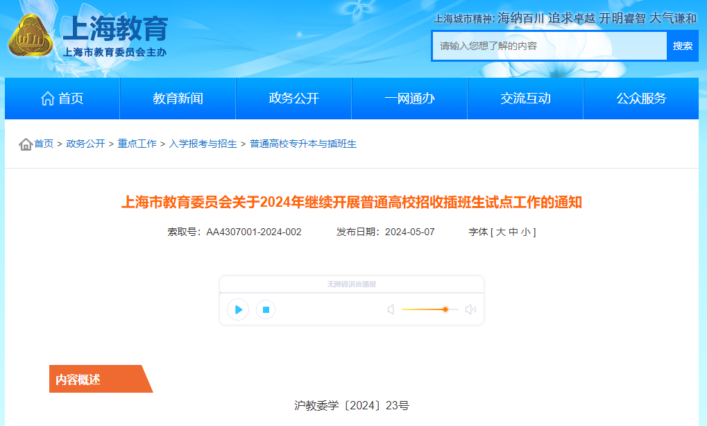 根据教育部办公厅《关于同意上海市进行普通高校专升本、插班生工作试点的批复》(教学厅〔2000〕4号),经研究决定,同意复旦大学、上海交通大学、同济大学、华东师范大学、华东理工大学、东华大学、上海理工大学、上海海事大学、华东政法大学、上海海洋大学、上海大学、上海政法学院、上海师范大学、上海立信会计金融学院14所普通高校2024年在部分专业中继续开展普通高校招收插班生试点工作。为做好本市普通高校招收插班生试点工作,各试点高校应精心做好各项准备,其他普通本科高校积极配合做好相关工作。现将招收插班生有关事宜通知如下: